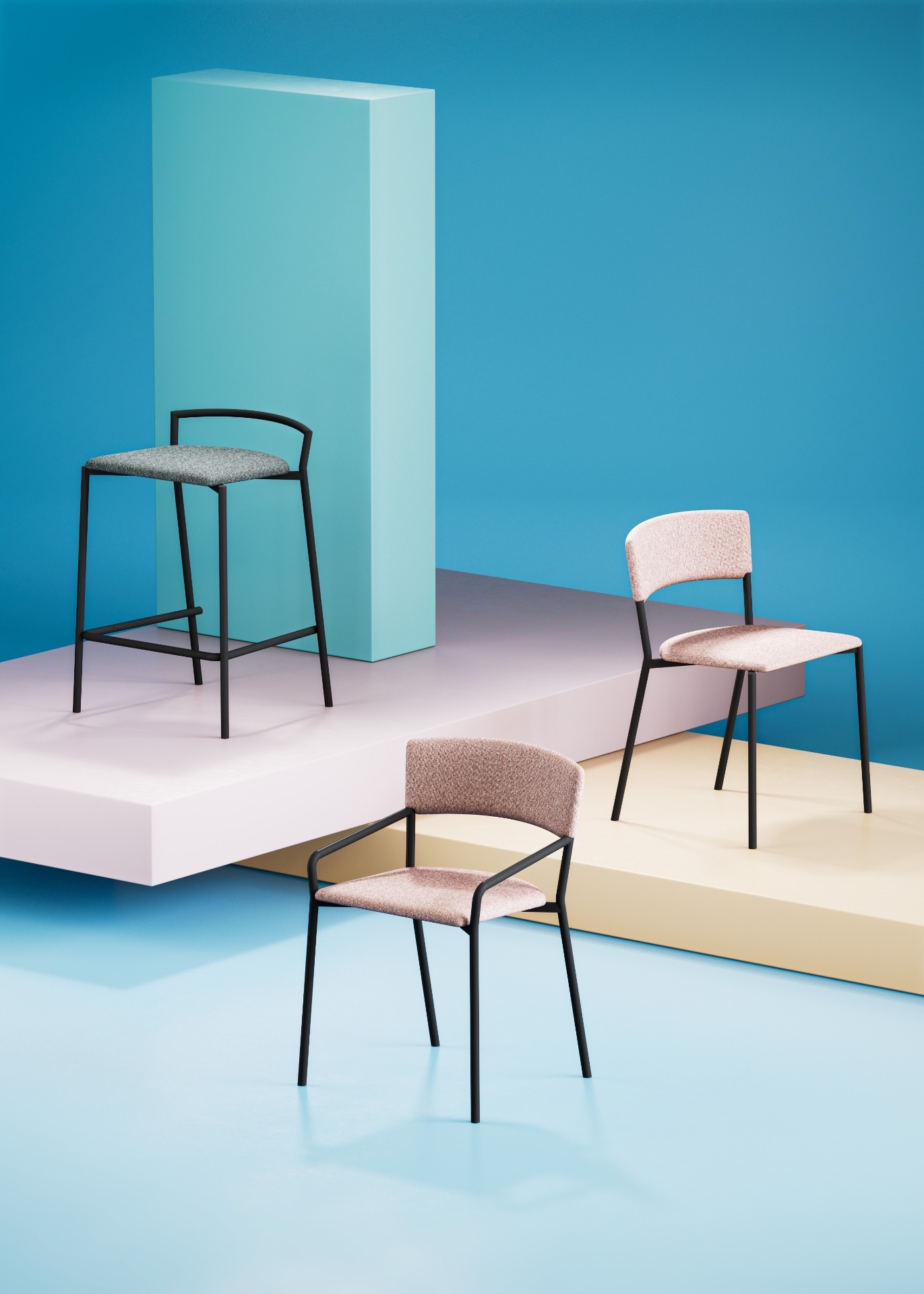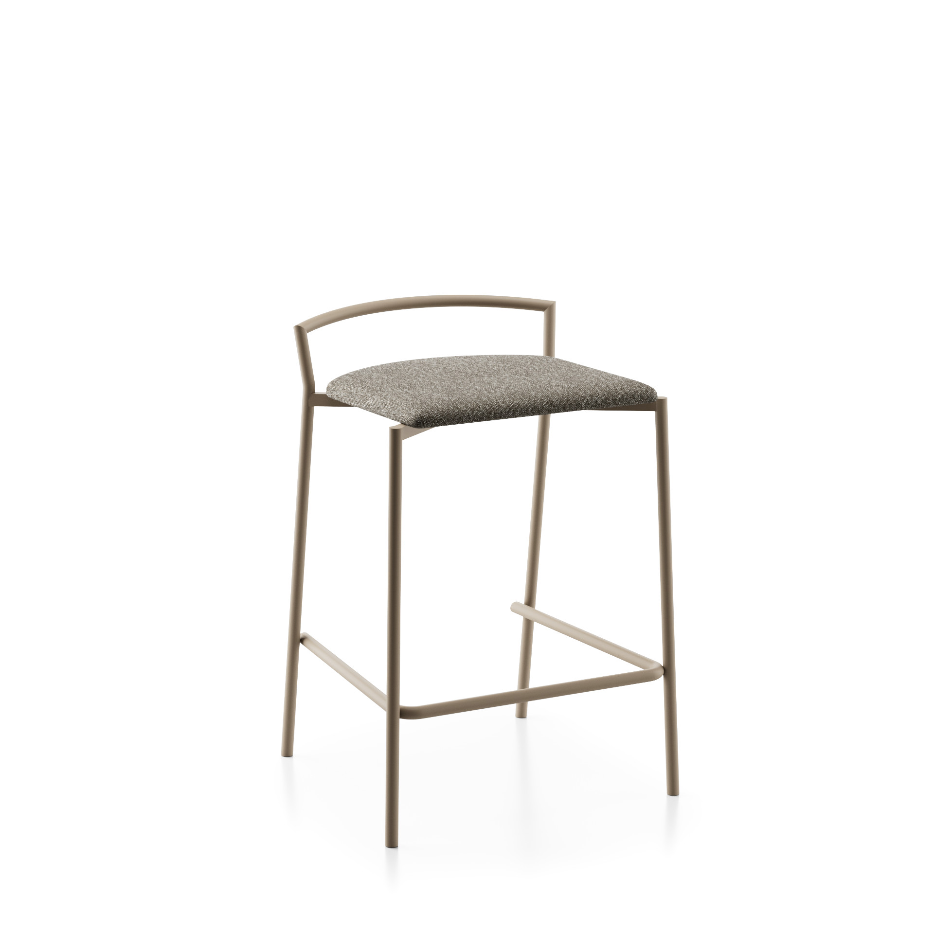 Taburete bajo Camilla. Estructura en acero, asiento tapizado. Altura asiento 65cm.